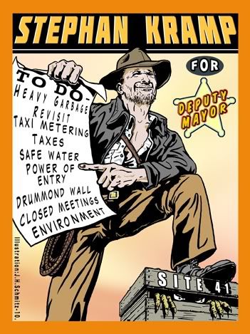 This is a piece I just did for Stephan kramp. He's running for Deputy Mayor in Midland this year. Its a post-card that will be sent out with the mail delivery to homes across the region. 9000 to be exact, Stephan said. He's a very cool guy with an excellent disposition. It was a pleasure working with him. Stephan's very patient and kind, and that worked out well when dealing with a temperamental Artist, who occasionally breaths fire ~ me ( ha ha !!! ) Stephan's balanced ideas and practical approach made this a very fun and enjoyable job. From start to finish. It was great. And I don't know if I've ever seen a client so happy with the finished product when they received it. It was total fun. Thanks man -