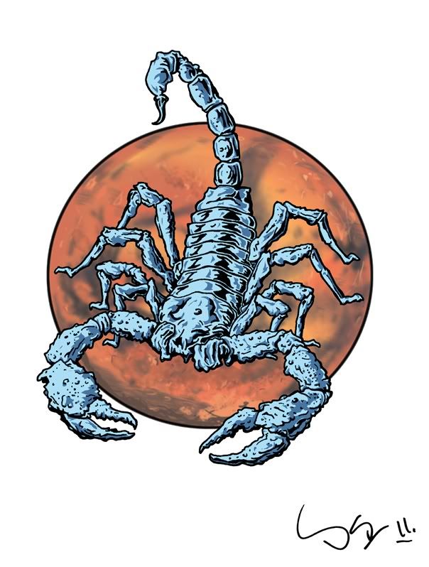 We bounced some ideas back and forth over a couple of sit downs - in public spaces, and some secret meetings elsewhere. We came up with this. The Scorpion in perspective over Mars. He likes Mars - birth planet - Zodiac. Planet of war - symbolic / mythological. Red - cool color. So I did up the semi-final designs, we proofed them - and then went ahead with coloring.