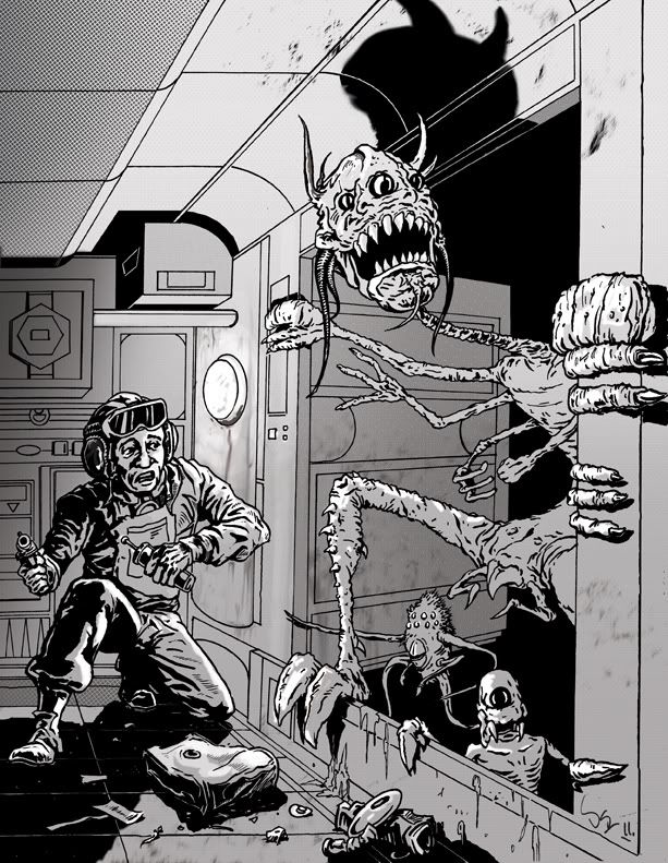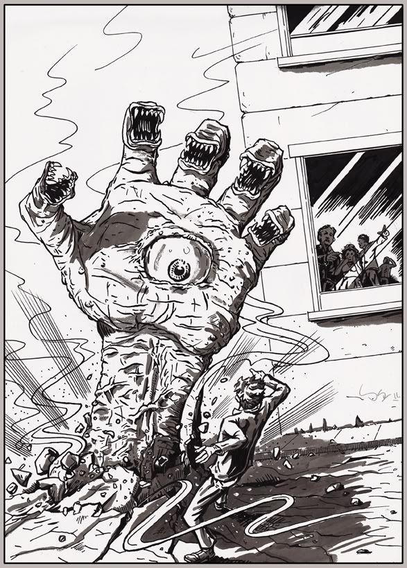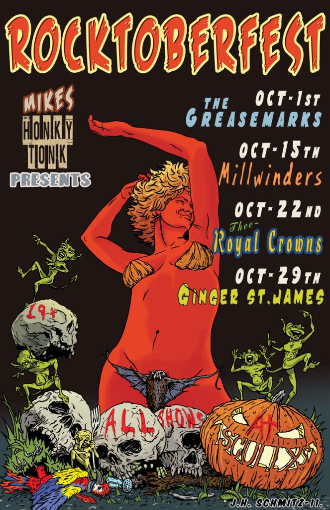 O.K. - So this is a poster I just designed, and executed for a 'Rockabilly' festival happening this month in Midland. I was approached by 'Honky - Tonk - Mike' to do it. And I dont think I've ever had a more interesting pitch than his - "James, I got a project here . . . right down your alley - think : half naked women, skulls, Rockabilly, hair grease, The Cramps, snakes, Halloween, motorcycles, Devils, etc - what'da ya think ???" 'Ummmm . . . . OF COURSE !!!'.
